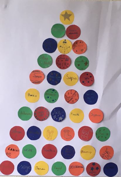 - Réalisation d’un sapin de la gentillesse fait en ronds de couleur. Les élèves ont écrit des compliments, des mots gentils sur des ronds. Ce sapin est en salle d’études.
