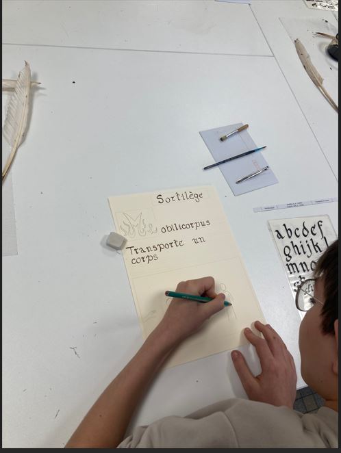 À la fin du mois de décembre, la magie s’est invitée au collège, dans la salle d’arts plastiques de Madame Manini. Les 3 classes de 5es ont reçu la visite de Dame Scribouillette, copiste du 15e siècle, qui est venue présenter son métier et a initié les élèves à la calligraphie et à l’enluminure.