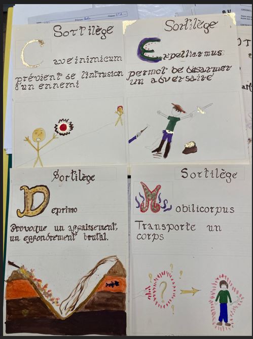 Les élèves ont appris à écrire au calame, à la plume métallique et à la plume d’oie. Ils ont fabriqué leur propre peinture à partir de pigment et de jaune d’œuf et ont posé de la feuille à dorer. Chaque élève a réalisé une page enluminée basée sur les sortilèges latins tirés du monde de Harry Potter.